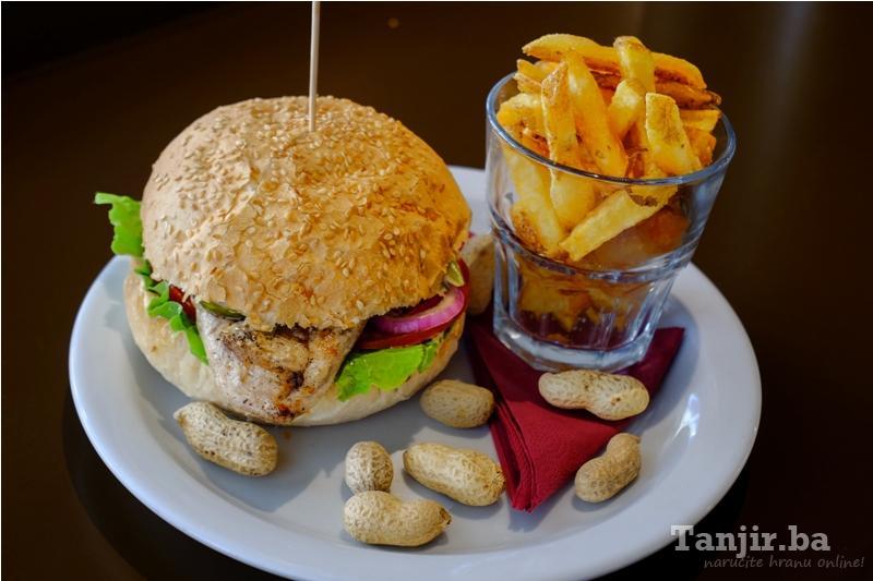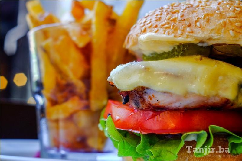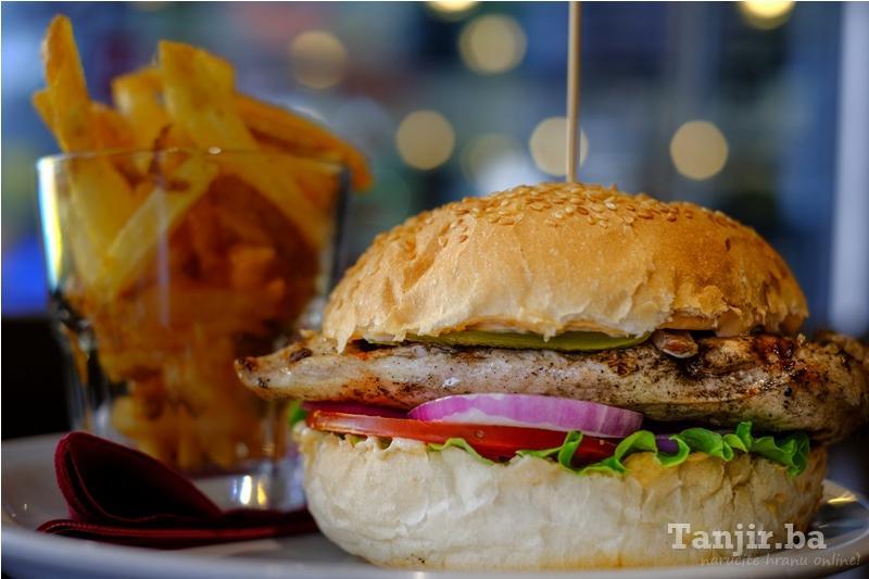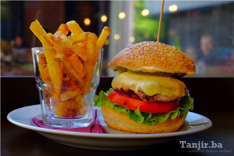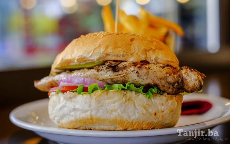 Pileći filet burger sa sirom i slaninomGrilovana pileća prsa sa istopljenim sirom pečenom slaninom, paradajz, salata, luk, kiseli krastavci11,00 KM