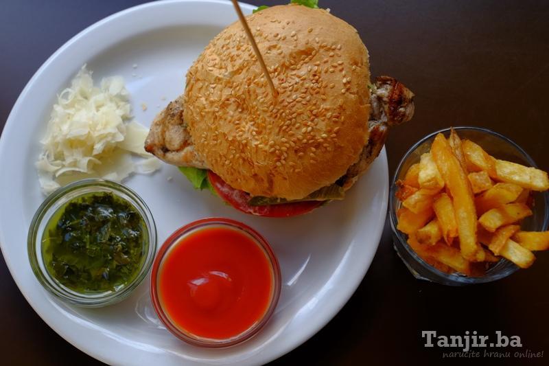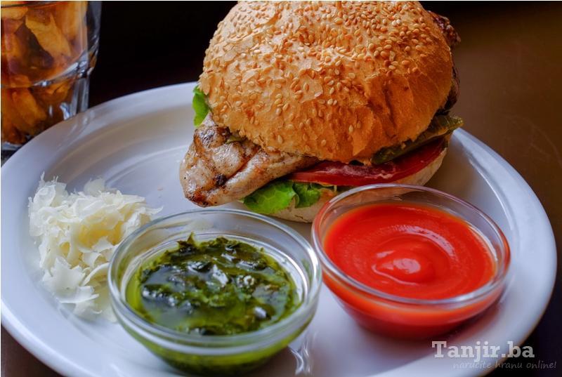 Mediteranski pileći burgerGrilovana pileća prsa sa parmezanom, pesto, paradajz sos, salata, paradajz, luk13,00 KM