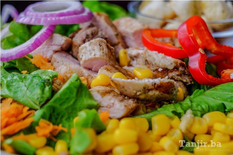 Pileća salataGrilovana piletina, paprika, kukuruz, ljubičasti luk, mrkve, zelena salata, krutoni, Blind Tiger dresingom9,00 KM