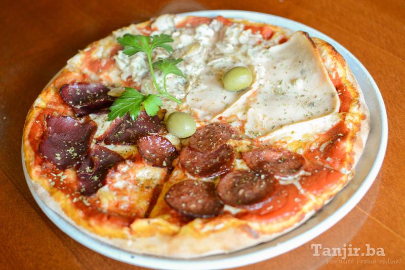 Pizza 4 godišnja doba sa Heljdomparadajz sos, sir edamer, suho meso, sudžuka, maslina, origanood 7,50 KM -