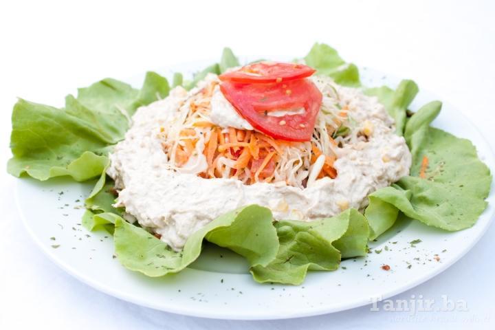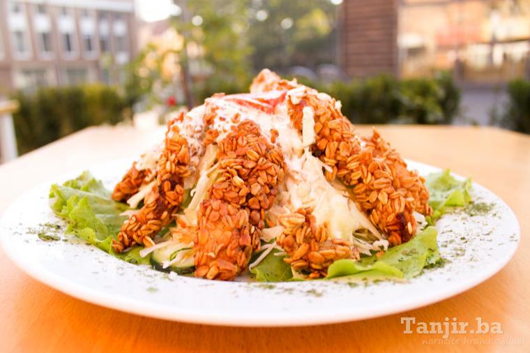Ta to tiSvježe sezonske salate sa pilećim rezancima pohovanim u zobenim pahuljicama i jogurt dresingom5,00 KM