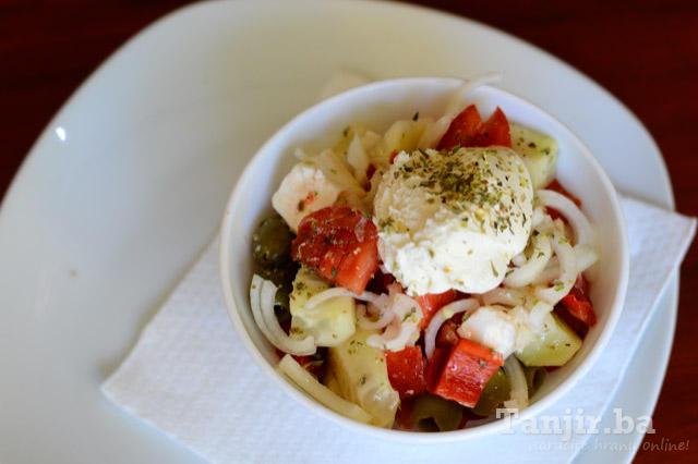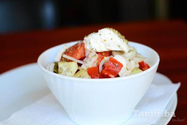 tuna, paprika, luk, krastavac, paradajz, masline, feta sir |