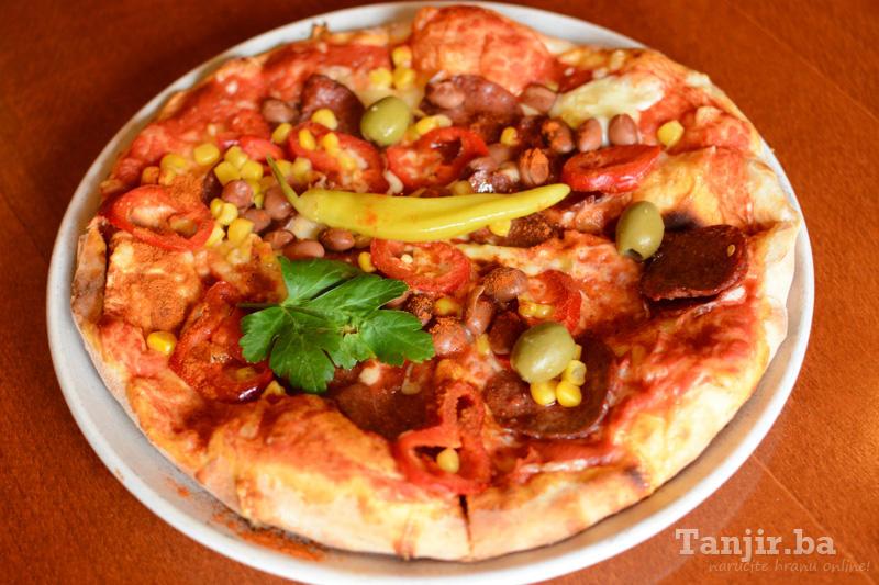 Paradajz sos, sir, kulen, šampinjoni, svježa paprika, fafaroni, grah, kukuruz |