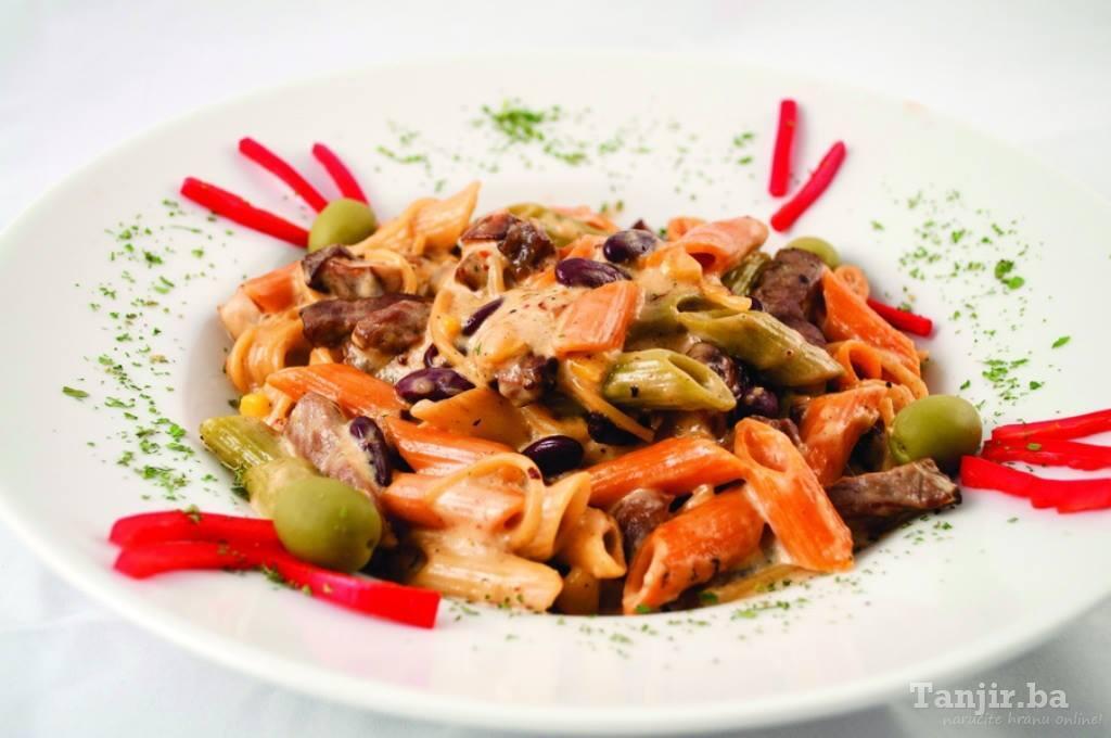 Piletina Quattropileći file na kockice, sos 4 sira (dimljeni sir, edamer, gorgonzola, parmezan), pomfrit, pecivaod 5,50 KM