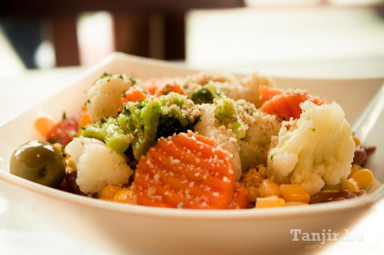 Vegetarijanska salataBrokule, karfiol, mrkva, paradajz, grah, kukuruz, dresing, mljeveni orasi + pecivo7,00 KM